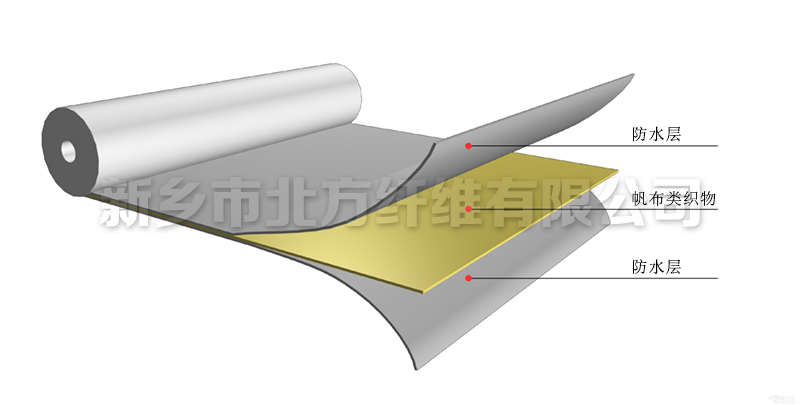 蓬蓋織物的結構類似于"三明治",即以帆布類織物作為骨架材料,在帆布的上下兩面涂覆防水層。帆布在其中起骨架作用并承擔力學性能,上下兩面的涂覆層承擔防水作用。