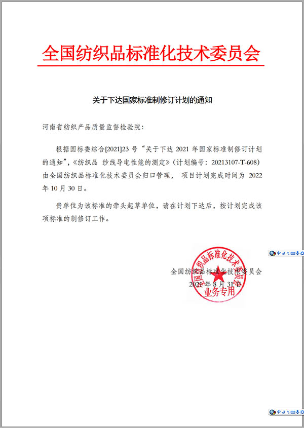 新鄉市北方纖維有限公司、河南省紡織產品質量監督檢驗院、華北水利水電大學合作的″紡織品紗線導電性能檢測方法"項目列入國家標準制修訂計劃。