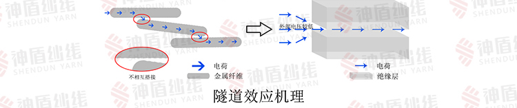 電紗線中,金屬纖維之間不能相互搭接,但其間距較小,無法形成鏈狀導(dǎo)電通道的情況下,外加電壓較低時,隧道效應(yīng)導(dǎo)電機理起主導(dǎo)作用;