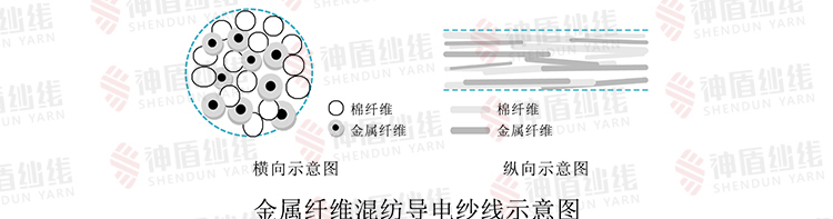 金屬纖維混紡導(dǎo)電紗線,是由金屬短纖維與普通的常規(guī)纖維按一定比例混紡制成的導(dǎo)電紗線,它是一種導(dǎo)電成份非均一性的導(dǎo)電紗線。它以普通的常規(guī)纖維為主體,以金屬纖維為導(dǎo)電成份。金屬纖維在此類紗線中的分布,從縱向看是大體均勻的分布,從橫截面看呈隨機分布狀態(tài),也就是說金屬纖維在導(dǎo)電紗線中不可能完全達到多相均勻分布狀態(tài)。